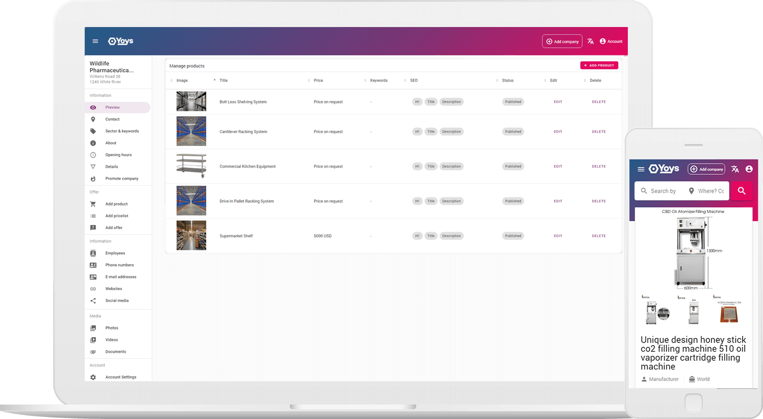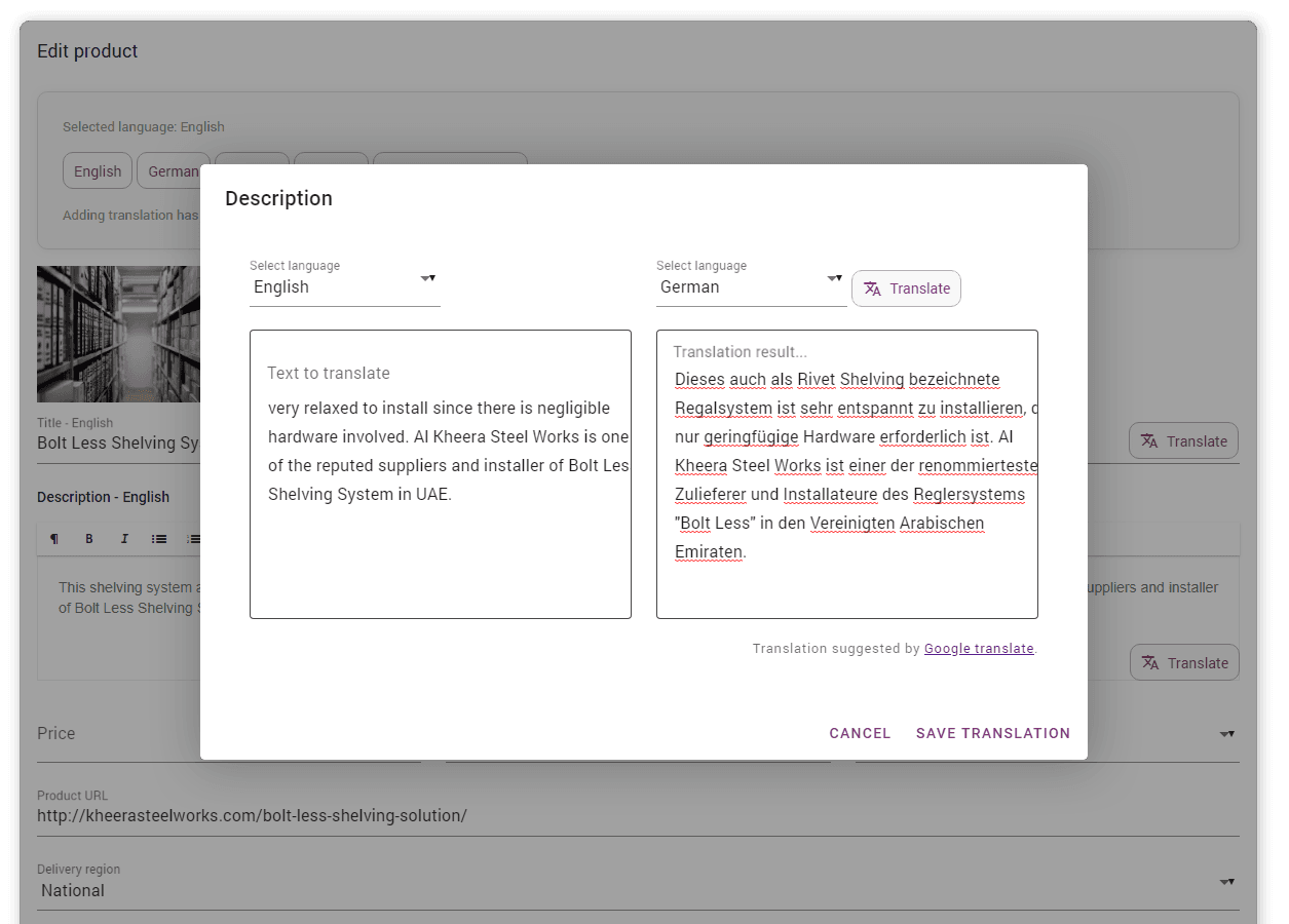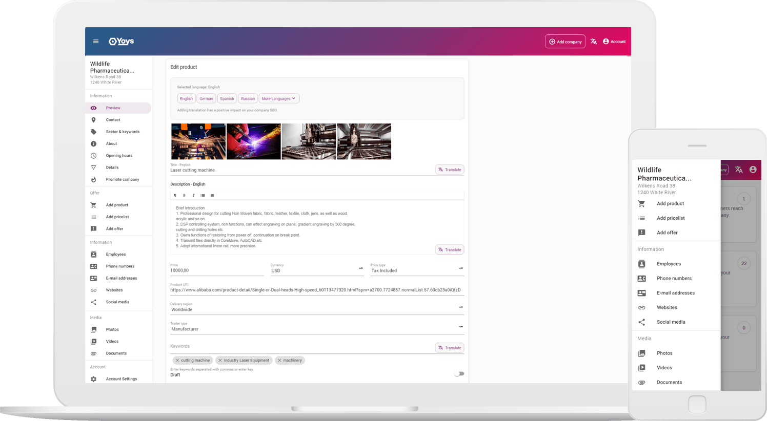 Présentez votre entreprise et vos produits avec des photos, descriptions, vidéos, certificats et produits traduits en 30 langues.